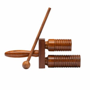 La malle des apprentis musiciens propose une diversité de percussions à secouer ou à frapper, fabriquées en bois, en fer ou en peau.